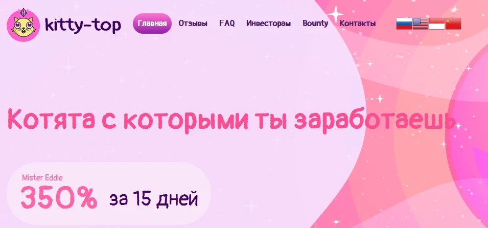 Данному инвестиционному сайту Kitty-top нельзя доверять, старые сайты этих злодеев уже закрыты, или просто заблокированы. Многие уже потеряли свои деньги. Положительным отзывам вообще нельзя верить, большинство из них заказанные за небольшую оплату.